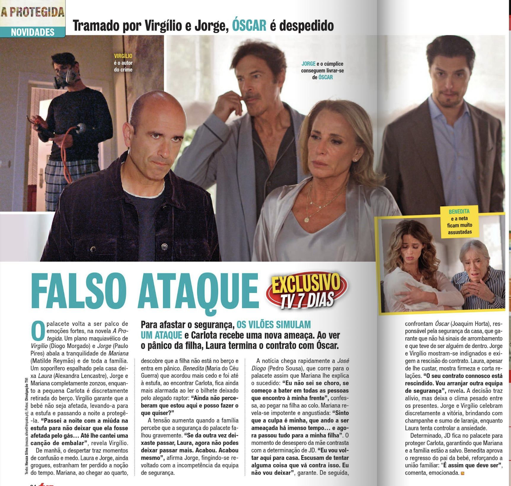 Na novela A Protegida, da TVI, as emoções intensificam-se com uma nova conspiração de Virgílio e Jorge. Os vilões simulam um ataque no palacete, colocando a família em pânico e levando Laura a despedir Óscar.